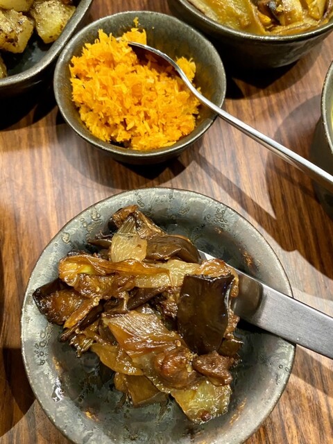 おかずは、丸干しいわし、パパダン、パリップ、茄子のテルダーラ、冬瓜カレー、ビーツカレー、キャベツテルダーラ、ポルサンボル、ケールサンボル。そして、ライスはバスマティとあきたこまちのミックス、なんとおかわり無料。