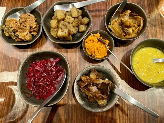 カレーは蛤を使ったシーフード。よくあるワンプレートではなく、自分で副菜を盛り付けて頂くのが楽しい。ソイミート、ビーツ、ココナッツ、牛蒡、ダル、菜の花、茄子、カブ、アチャール、パパダム。