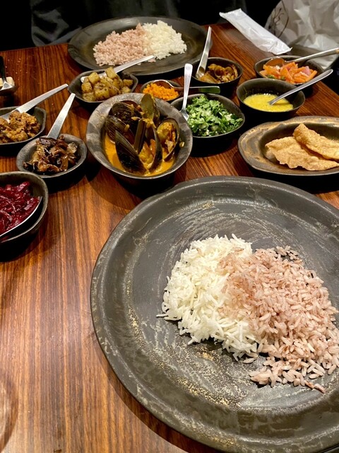 赤米のココナッツスープ(お粥)、チャパティ菜の花と玉ねぎを乗せて、エッグホッパー、牡蠣のアンプルティヤル、パティス(揚げ餃子)。