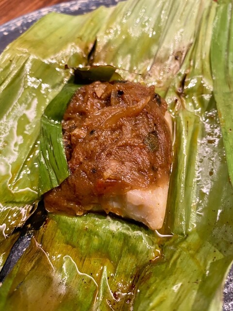 スリランカと言えば魚です。これはイサキを使ったマサラ蒸し。バナナリーフに包んで蒸し、玉ねぎの甘みとマサラのスパイシーな風味に、ふわっふわのイサキが完璧に調和してます。