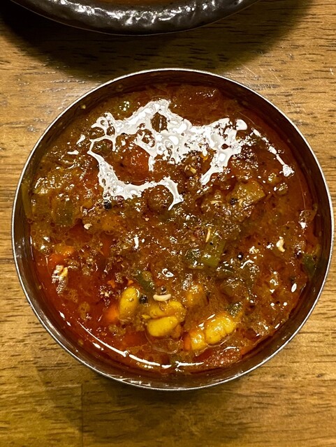 贅沢に大きな蟹を入れた和テイストが名見え隠れするラッサム。トマトとタマリンドの酸味がベースになっていますが、その後に円やかで奥深い酸味が。梅を使っているようです。蟹の旨味が溶け込んだ、シーフード感たっぷりな濃厚ラッサム。お代わりしたかった。