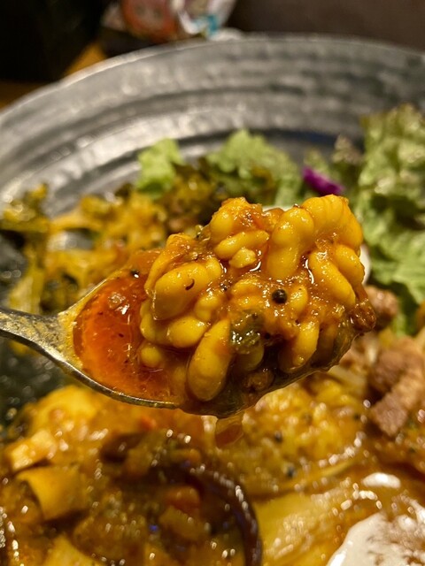 コルマは複数のカレーを混ぜるときに最も真価を発揮する、スリランカカレーのパリップのような効果のあるカレー。野菜の旨味が万能であることがよくわかる。ココナッツミルクとヨーグルトを使っているので、非常にコクがありまろやか。とろっとした口当たりの茄子がたまらなく美味しいのです。辛さが苦手な方は、コルマをベースにして、他のカレーを「ぷち」でオーダーするのもアリです。また、激辛限定カレーやラムカレーなどスパイスがバチっと決まったカレーとも相性が良い万能カレーです。