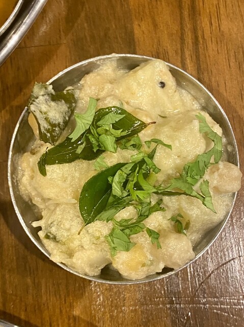 サンバルも非常に美味で、豆の優しい甘味と一緒に濃厚な旨味がしっかり感じられます。これはお代わり推奨。味噌汁のように飲み干し、カレーと混ぜるためにもう一杯もらいました。