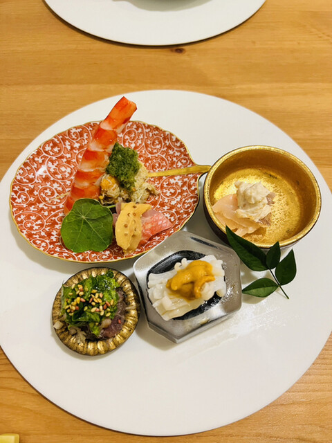 存在感のあるカニのほぐし身がどーんとあり、繊細で美しい季節の新鮮な魚が並ぶ。