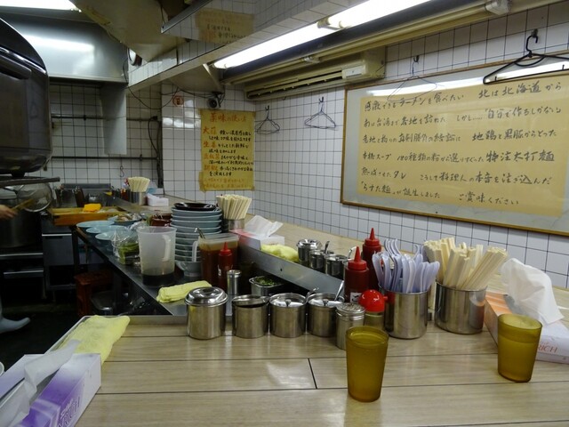 小田急線・祖師ヶ谷大蔵駅・北口から数十メートルという場所は、駅からのアクセスは抜群でして、入店しますと窮屈感満載の店内には、大陸系の方が店舗前に乳母車を置いての4人連れで来店の他、変形したカウンター席には男性客3人という先客状況です。