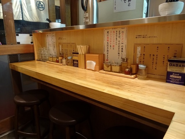 カウンター席のみの店内、中ほどに着座して20代半ばから30代と思われる男性店員に麺柔らかめ注文でプラ券を渡します。
