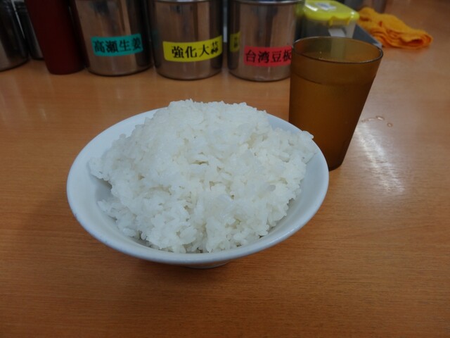 最初の1杯のみ無料サービスのライスですが、注文時、大・中・小とチョイスが出来まして、ココは迷わず大ライスを頼みましたが、家系でよく使われているライス用の器に、押し込められるように入っておりまして、ガッツリ感満載の無料ライスでした!
