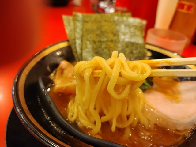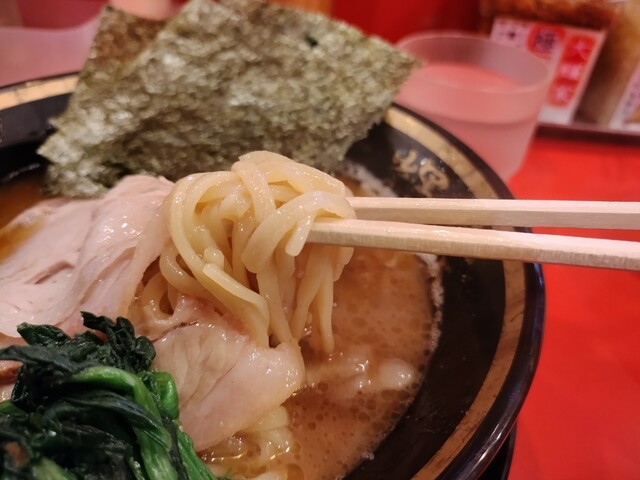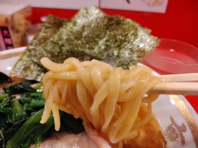 頭の中で「旨いっ、旨いっx1億乗」レベルで駆け巡り、麺の太さから「杉の印酒井製麺」(杉の印麺は本来、吉村家直系でしか使用できず、しかも釜茹で店のみという条件が付いてきますが、大輝家系列は使えるようですね)、7分茹では今回、私の求める柔らかさにドンピシャです!