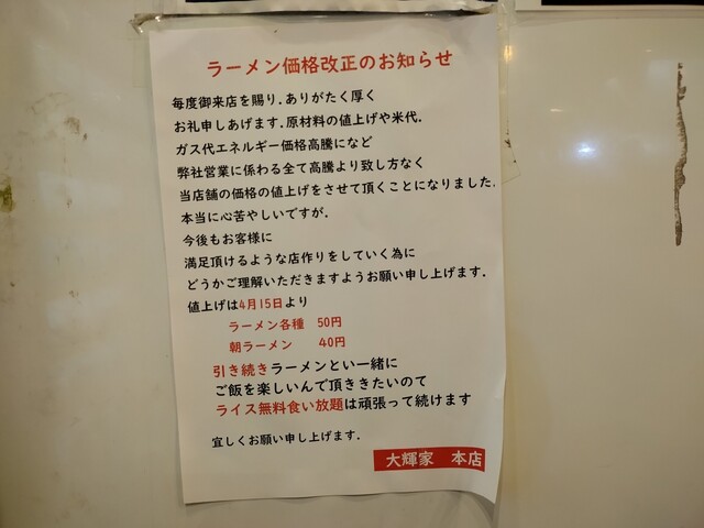 ライスバー形式の終日無料食べ放題ライスという家系ラーメン店に限らず、飲食店としての最大の"武器"を備えた、強力無比、ライバル店は絶対にこの「大輝家」は追い越せないという私独自の判断となる「満足度天文学的数字」というお店となります!
