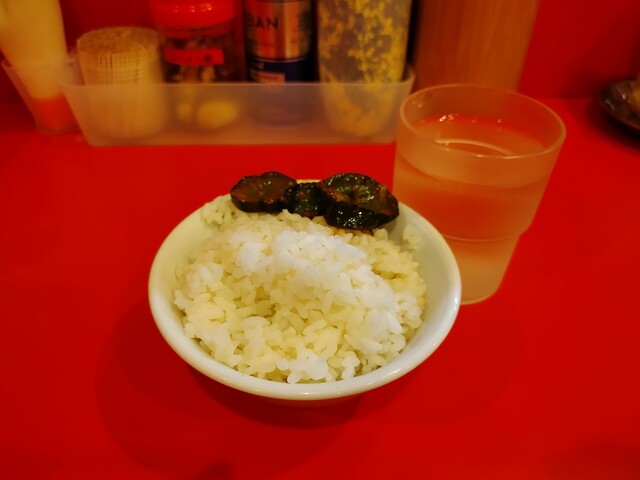 先客は数名程度でして、入って左側にある券売機でデフォルトラーメン税込み800円とライス食べ放題税込み100をポチリ、カウンター席一番左側へ着座の、風体から東南アジア系と思われる男性店員に麺茹で時間7分茹でで食券を渡します。