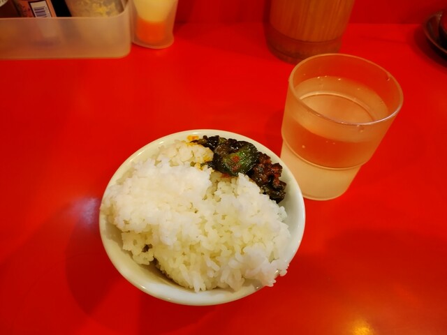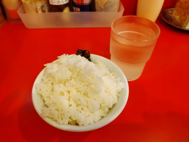 券売機出デフォルトラーメン税込み900円とライス食べ放題税込み100円をポチリ、いつもの席へ着座の、麺7分茹で指定で食券を渡し、約8分で着丼です!
