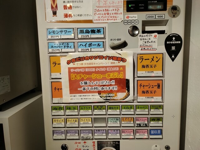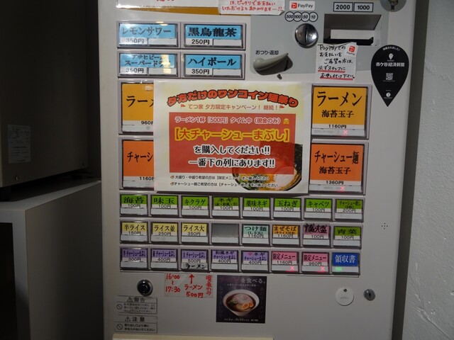 しかし、流れがよく、数分ほどで入店の入って右側にある券売機で食券購入を促され、16時~17時30分の時間限定税込み500円ラーメンと並ライス税込み250円をポチリ、購入後この時点でフロアー担当の男性店員にお好みを伝え、食券を渡します!