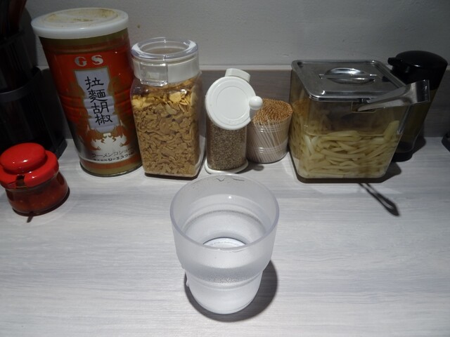 店内は既に満員御礼状態でしたので、麺7分茹で指定は伝えず、直系系譜なのだから、酒井製麺の麺箱はどこにも見当たりませんが、恐らく酒井製麺だろうという予測から、麺バリ柔指定のみで食券を渡したあと、狭い左側の後方で待たされました。
