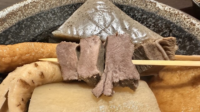 こんにゃくには細やかな隠し包丁が入り、噛むたびに出汁の旨みが広がる。