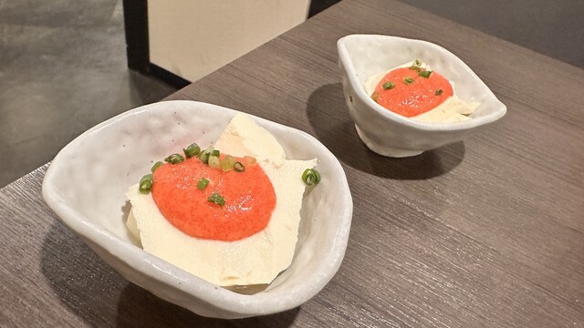 柔らかな豆腐の上に、鮮やかな明太子ソース。