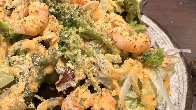 彩り鮮やかなブロッコリーとぷりっとした海老、シャキシャキのオニオンスライス。