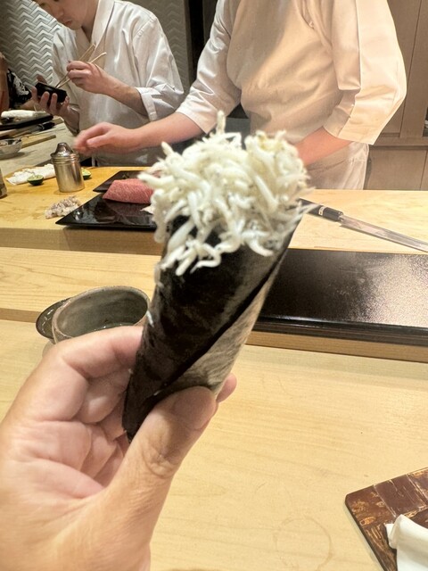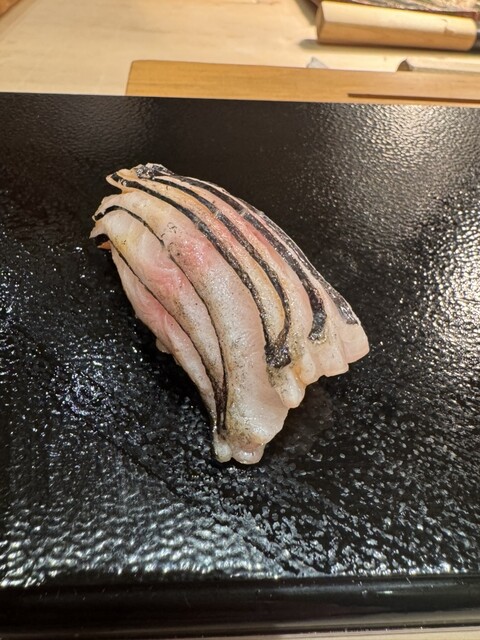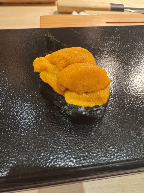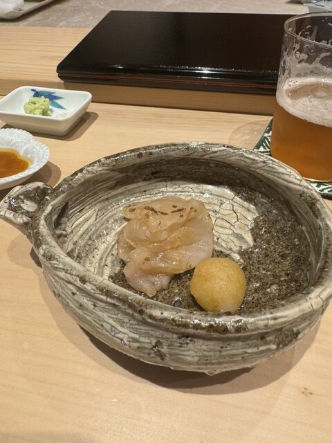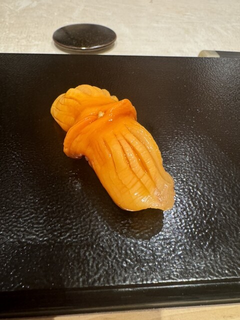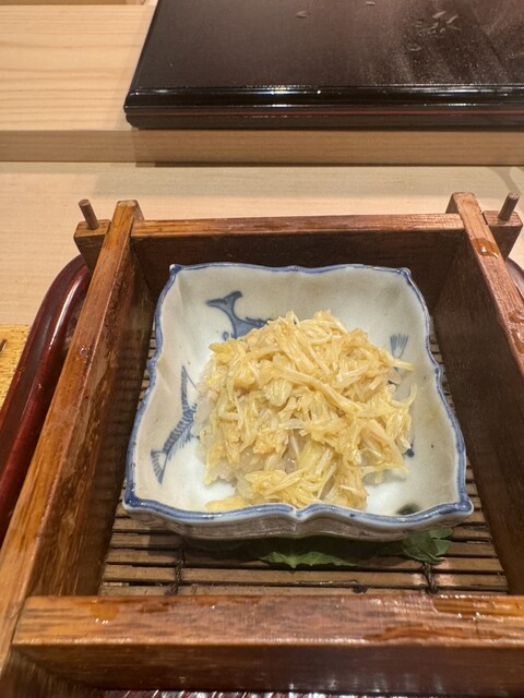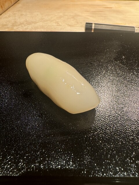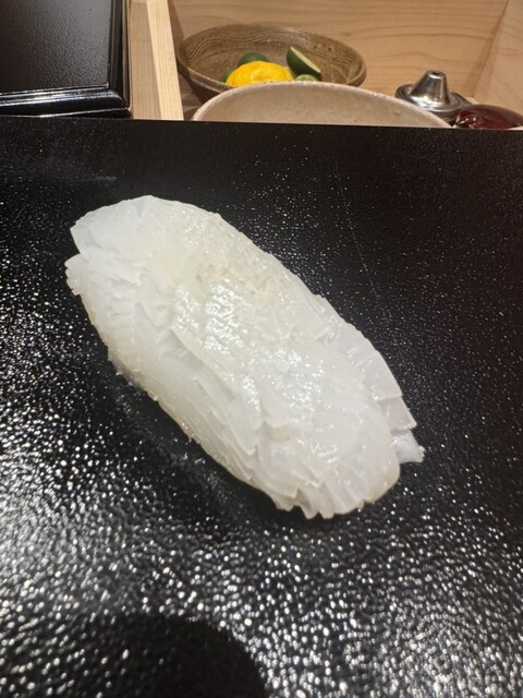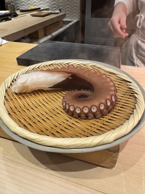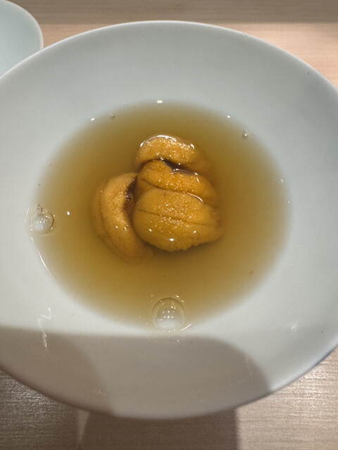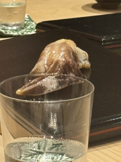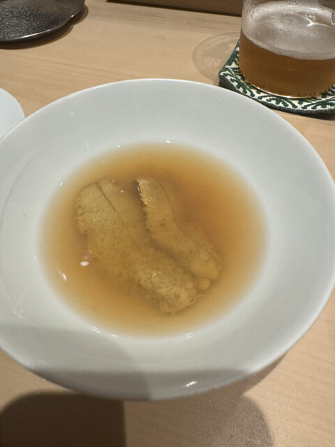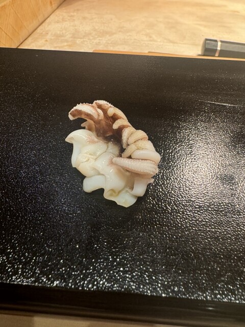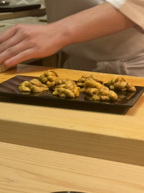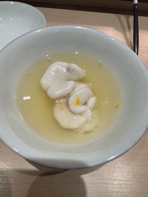 シンコ、シンイカなどの季節の定番から、宮津の極厚天然トリガイ、朝どれ北海道直送イクラ、赤ウニなどが大将の実力と情熱を認められることで仕入れできるようになった希少ネタ、紫ウニアワビスープ、アワビ肝スッポンジュレ、ケガニスッポンスープなどの毎回変化するオリジナルつまみ、豊富な追加ネタ(今回全オーダーしました)。