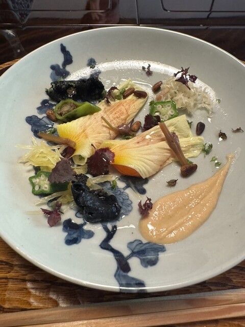 琵琶湖ます オクラの花びら包 山椒オイル ゴマ酢 イワタケ 絶品