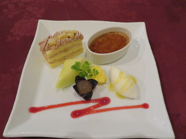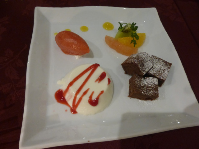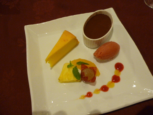 かぼちゃのケーキ、苺のソルベ、チョコレートムース