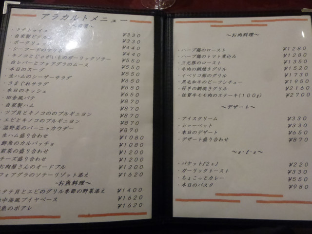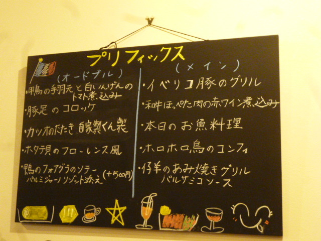 プリフィックスコース3500円、黒板記載のオードブルとメインから一品ずつ選択出来る楽しさがある