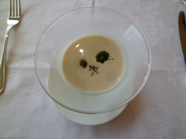 スープの中にパセリのソースと刻んだトリュフを入れている