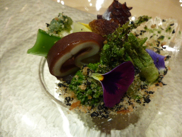 ①春野菜とイイダコ ほうれん草とブラックオリーブを砕いたソース