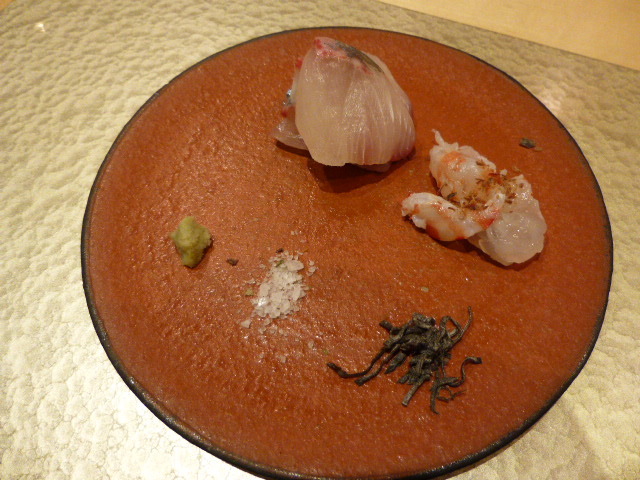 甘鯛の下には緑色のネギソース 隣には大吟醸と卵の黄身を混ぜてアルコールを飛ばしたソース