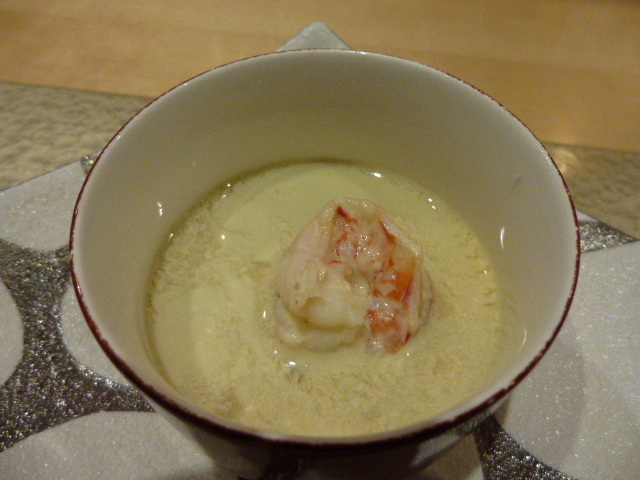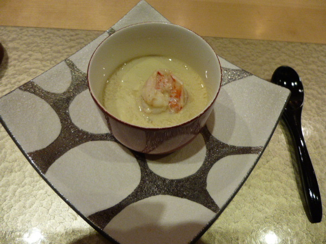 茶碗蒸しの具には一番上にのってる車海老と中に入ってる鯛、アカネ芋がある