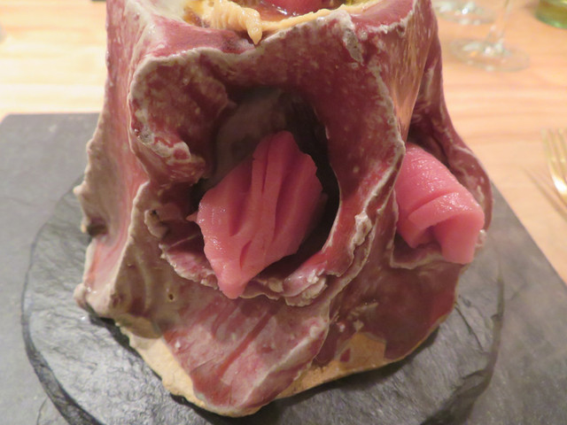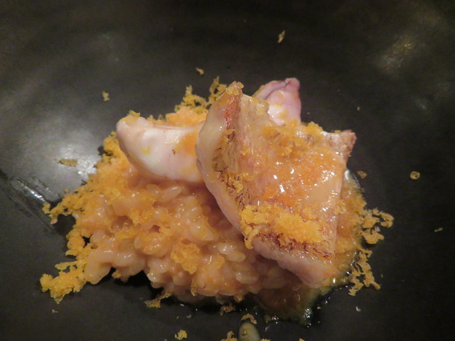 ウニとカラスミのリゾットの上にアカムツとキアラの炭焼きがのってる