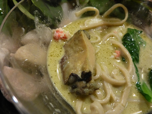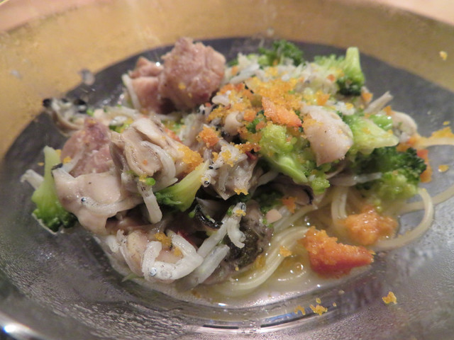 牡蠣刻んだものとカラスミ、他にブロッコリーや白魚が使われてる