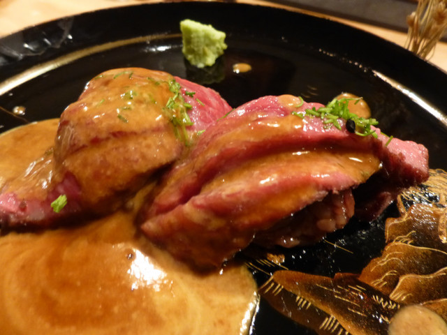 穴子を焼いたのと黒毛和牛細かく切ったのが中に入ってる