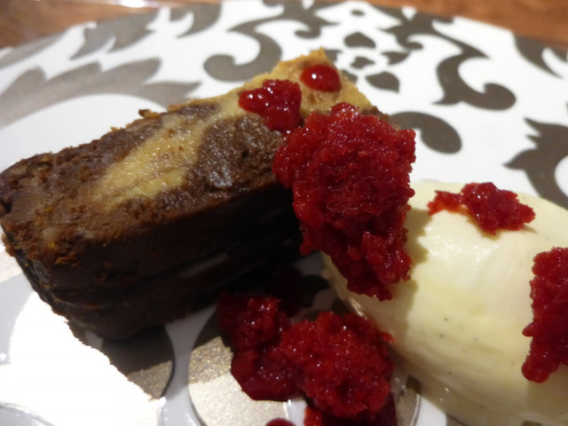 チョコケーキの上にバニラアイスとマスカルポーネ