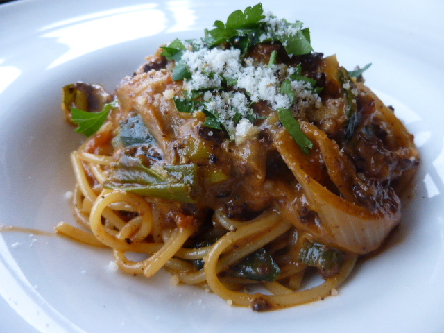 豚煮込みと焼きネギのパスタ