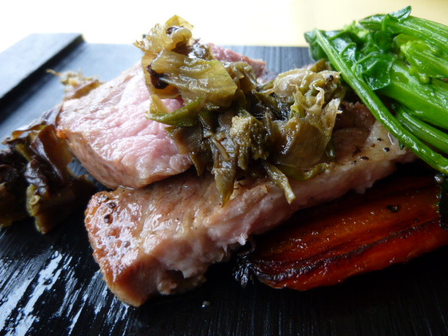 豚肉の上には焼いたフキノトウを刻んだものがのってる 若干苦味を持たせた味