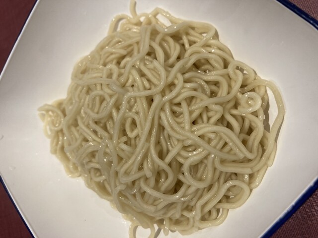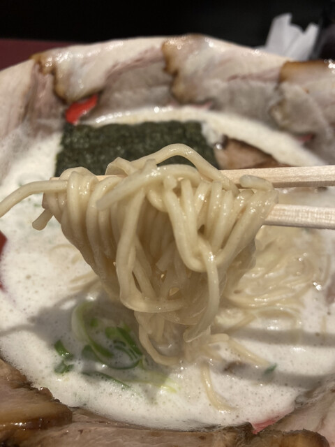 あっさり風な鶏白湯ですね。もっと濃厚な脂感を想像していましたが、あっさりに感じるのは多分エスプーマの影響かな?もちろん鶏白湯も美味しい。麺は中太で豚骨よりもやや太めかな(うろ覚え)食感はもちもちしていて麺も美味しいです。