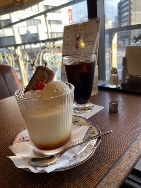 14時以降はスイーツセットが注文できるようで、プリンとアイスコーヒーのセット(850円)を注文。