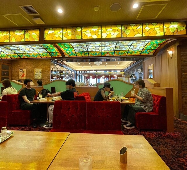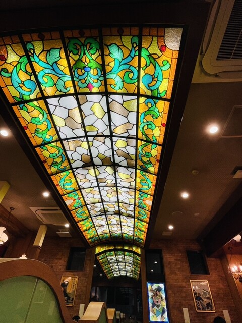 店内は以前と変わらず天井のステンドグラスや紅いベロア調の椅子などレトロ純喫茶な空間は健在でトキメキます。