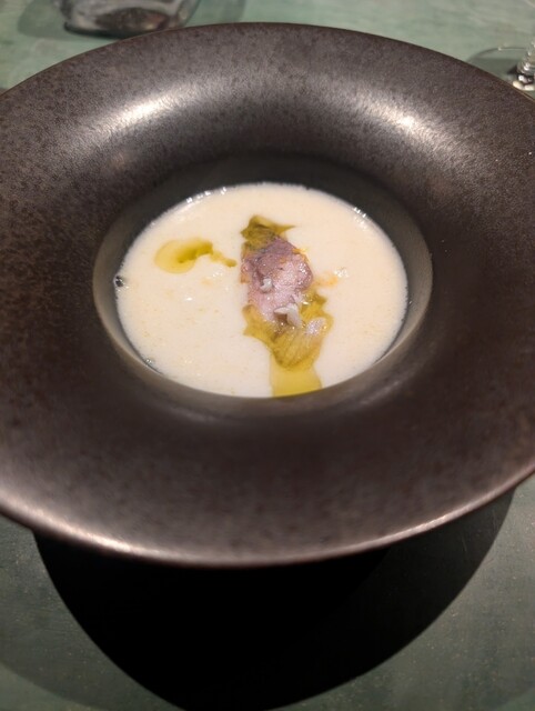 鯵と蕪のポタージュ>オリーブオイルに唐辛子が加えられているか、スパイシーながら食欲をそそる一品