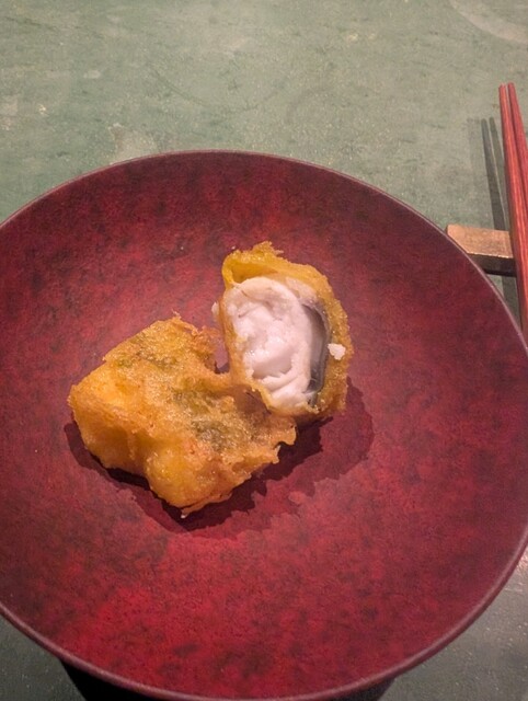 にべ鯛の唐揚げ>カレー風味の衣がサクサクで、柔らかい白身魚を引き立てます