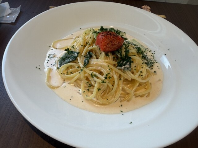 「ランチコース(税別2,000円)」を食べました。パスタを選択しました。「海老のカルボナーラ」と「明太子のパスタ」を食べました。パスタはもちもちの食感です。コースには「ドリンク」と「ドルチェ」が付きます。食前、食後はスマホから行います。