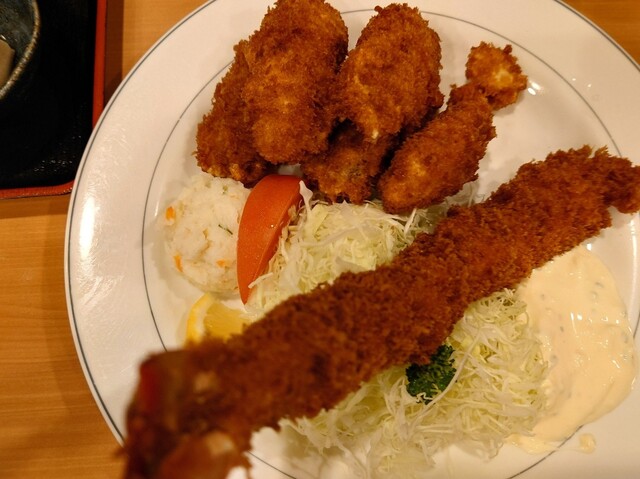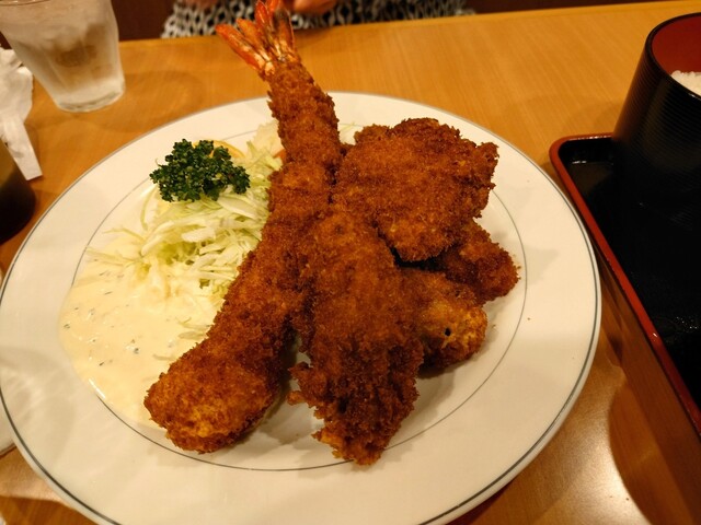 牡蠣エビセット(ご飯少な目)・・・ぷりぷりの大きいエビフライ。何もかも美味しゅうございます。