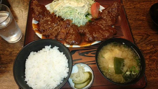 トンカツ定食・・・相変わらず、、、で、で、でっかい(;´・ω・)普通の店と言うより、この店の前に有る、食品サンプルのカツの倍やんか!正に2枚分・・・(;´・ω・)\(^o^)/