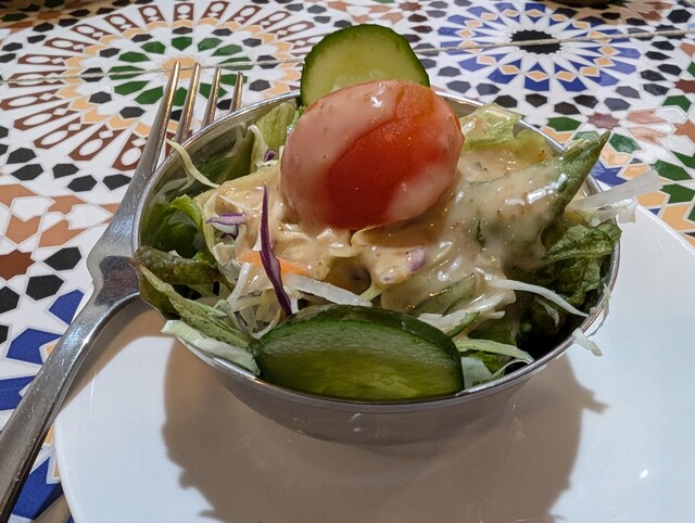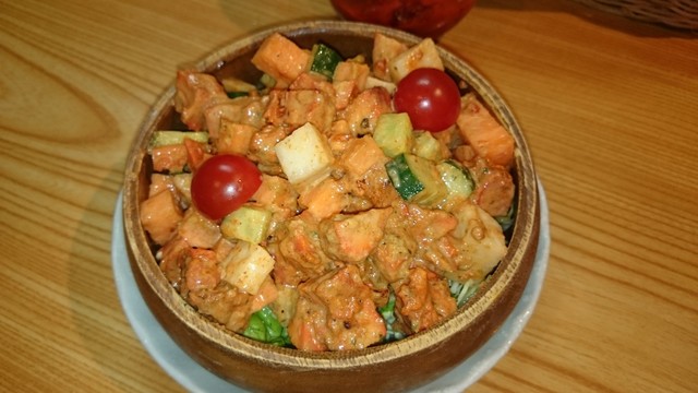 チキンチャート・・・知人のお勧め。野菜がゴロゴロ。人参・大根・胡瓜と賽の目に切って有ります。スパイスなドレッシングと良く合います。チキンは、柔らかく食べやすいですが、野菜が若干、硬いです。(T_T)