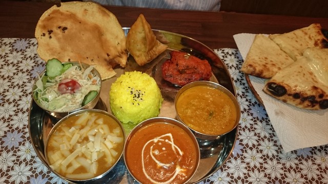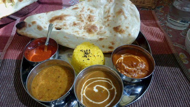 ランパスで食べれるインドタリーセットナン、ターメリックライス、チキンカレー、ベジタブルカアレー、ビーンズカレー・辛さを追加するチリパウダ