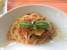 次は、本日のパスタで、この日は「カジキの皮と野菜のトマトソース」です。パスタはトマトソースの甘み、麺の茹で具合との完璧で、まさか、小さな離島でこんな本格的なイタリアンをワインを飲みながら食べられるなんて思ってもいませんでした。