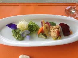この日の前菜は、投稿写真の右からビーツ、シーラの玉子、島人参とフェンネルのピクルスで、左がゴーヤとモーウイ(白い食材です)のスライスです。