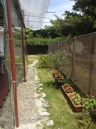 この日はややうす曇でしたが、それでも夏至直後の沖縄の太陽は真上から攻めてきます。手に持ったペットボトルから水を補給しながら、強い海風にも助けられ、ようやく集落にたどり着くと「ゲルマニヨン」さんの看板が見えて来ました。