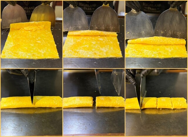 たこ山芋手順写真①卵を広げて上に生地を乗せ、ひっくり返してカット。