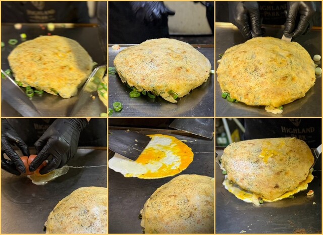 ねぎ焼きレシピ④ひっくり返して、鉄板に着いている記事にヘラを入れ、くっつかないようにする。別鉄板に卵を落としヘラで広げ、その上に生地ごと乗せる。