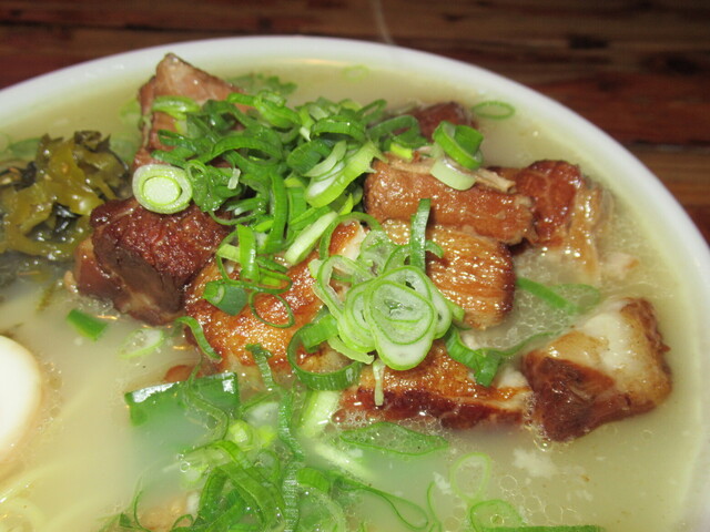 麺を食べ、豚を摘まみ・・・,時々スープを飲む。